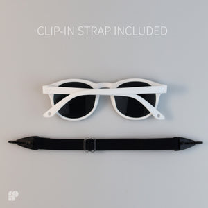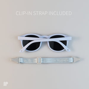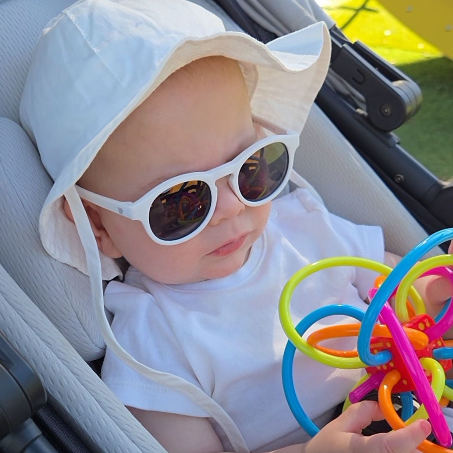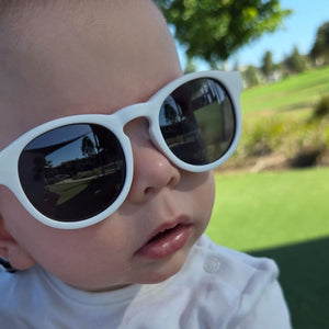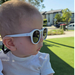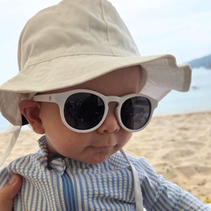 Polarised lenses block glare and 100% of UV rays. Flexible frames survive being grabbed, dropped, and chewed on. The adjustable strap keeps them secure from first beach trip to second birthday.